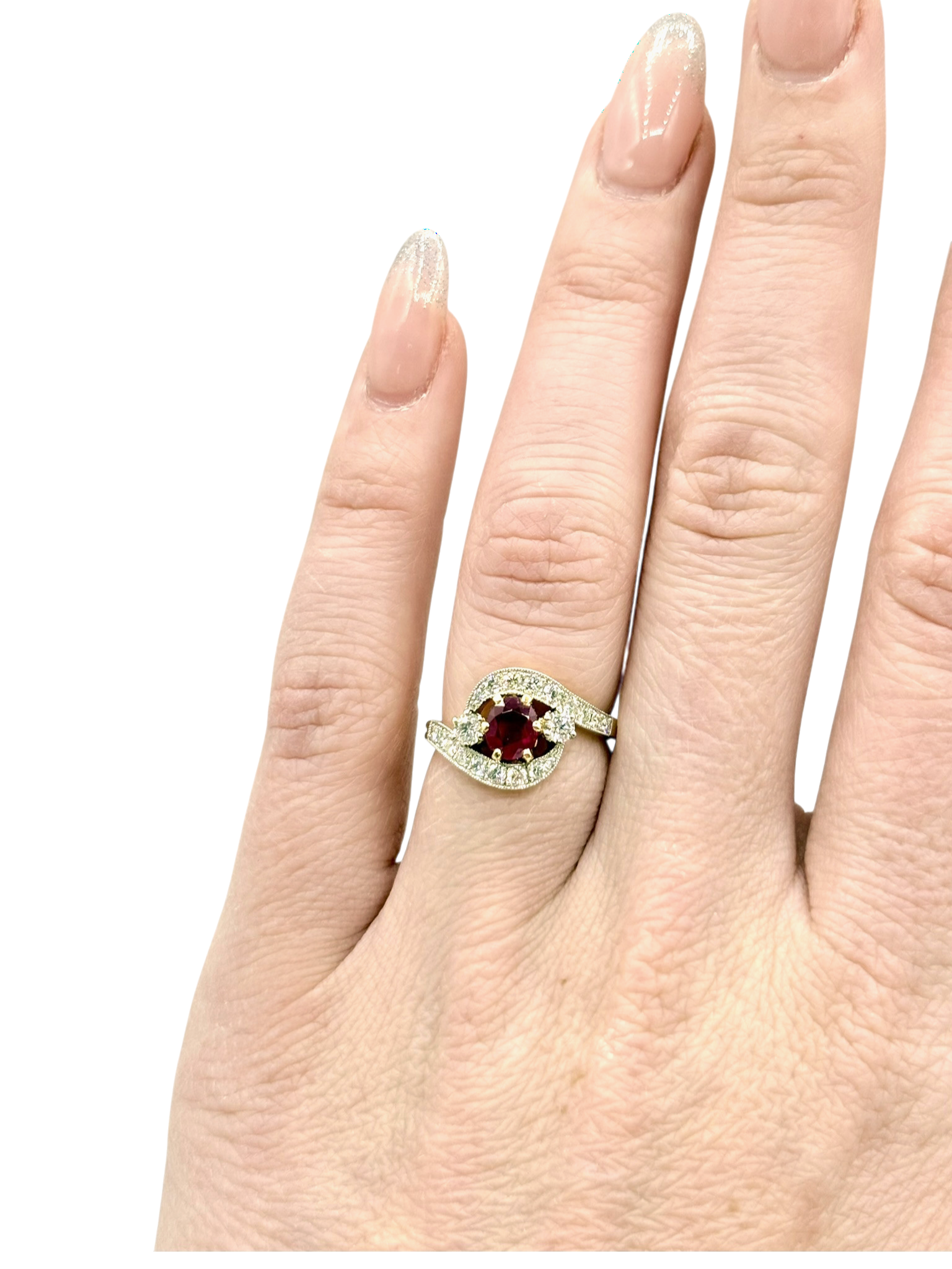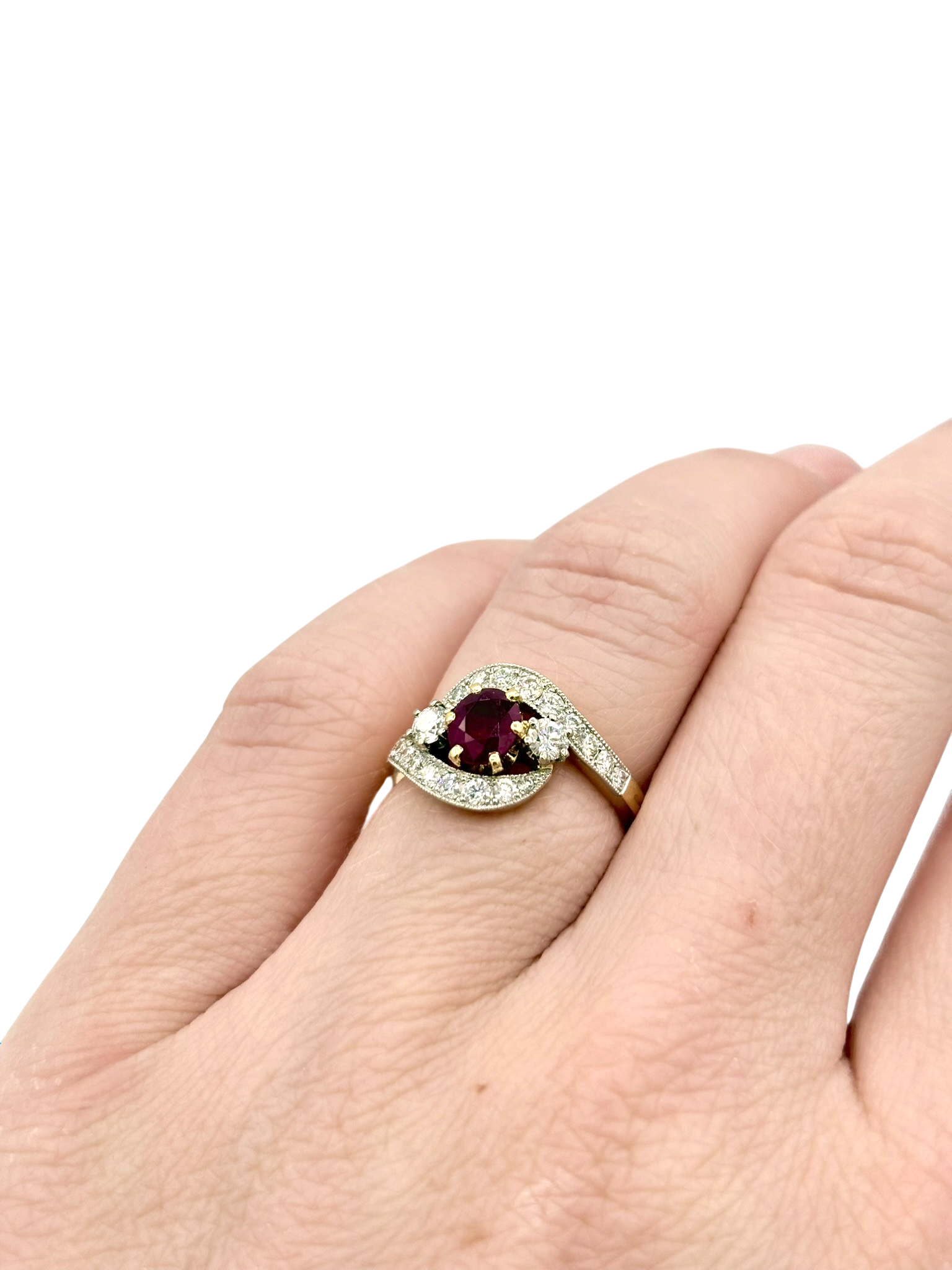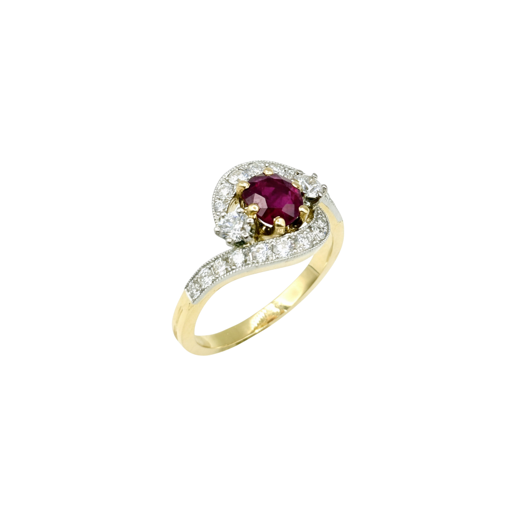 Bague neuve en or jaune 18 kt, 750/1000èmes sertie en son centre d’un rubis pesant 0.87 carat, entouré de diamants naturels pour un total de 1,31 carat pour un poids de 0,64 carat.